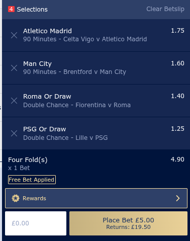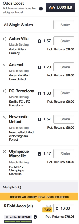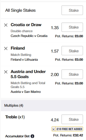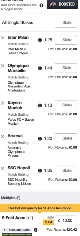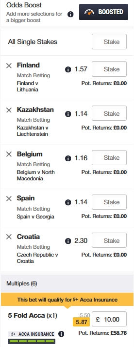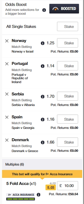 £10 Norway, Portugal, Serbia, Spain, Denmark @ 5.05 boosted with insurance