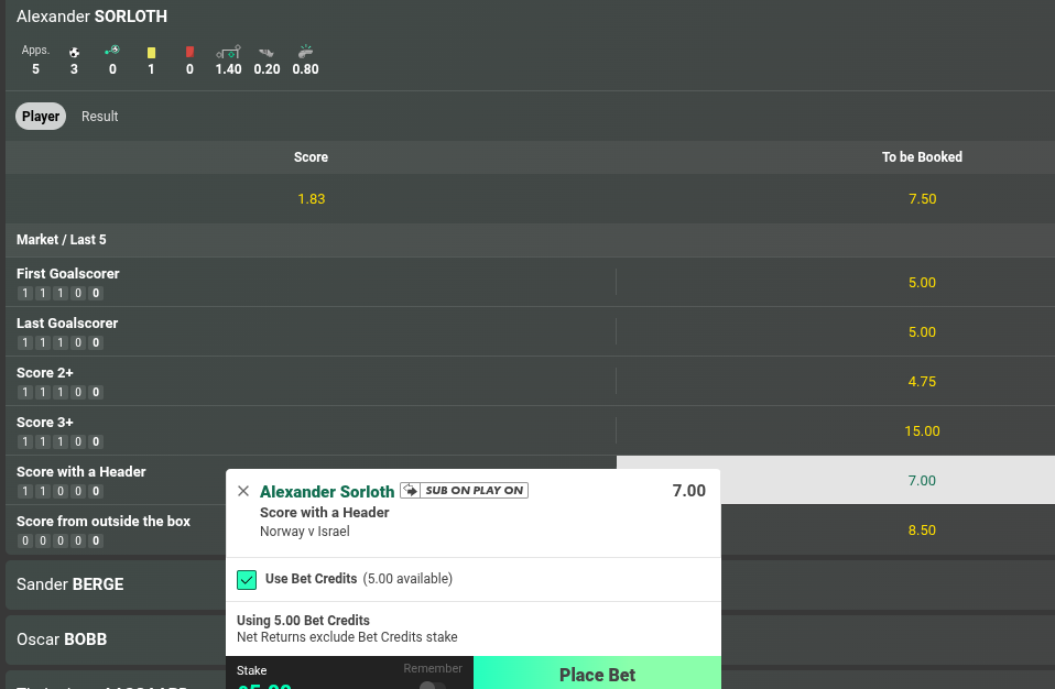 £5 Bet Creidts Alexander Sorloth to score a header @ 7.0