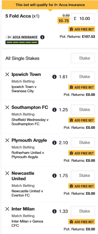 £10 Ipswich, Southampton, Plymouth, Newcastle and Inter @ 10.75 Boosted with Acca Insurance