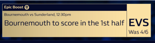 £10 Bouremouth to score in the first Half @ Evens