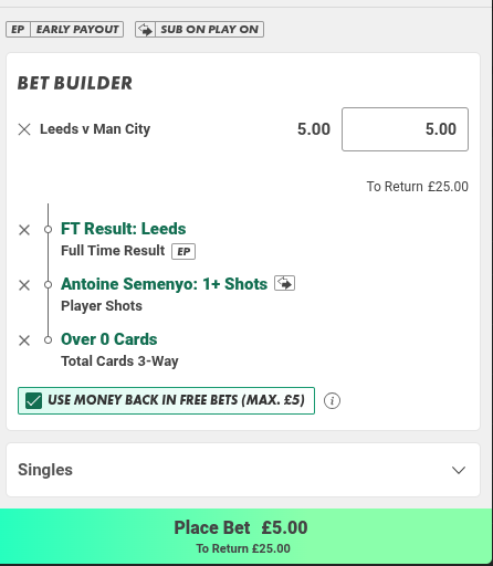 £5 BetBuilder – Leeds to win, Semenyo 1+ shot, Over 0 Cards @ 5.0