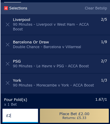 Liverpool, Barcelona Double Chance, PSG, York @ 1.67/1