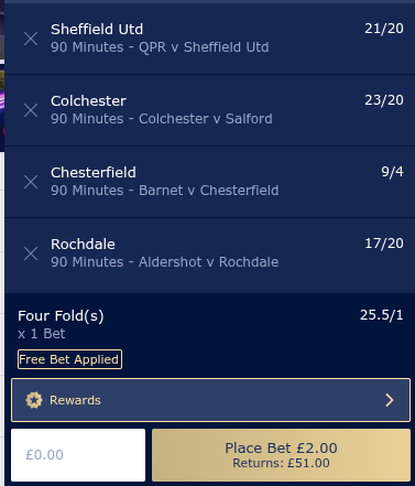 £2 FB Acca: Sheff Utd, Colchester, Chesterfield, Rochdale @ 25.5/1