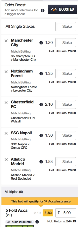 £5 Man City, Forest, Napoli, Atletico Madrid and Chesterfield @ 8.83 Boosted with Insurance