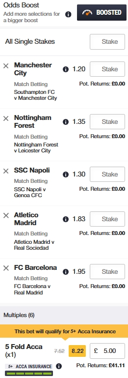 £5 Man City, Forest, Napoli, Atletico Madrid and Barcelona @ 8.22 Boosted with Insurance