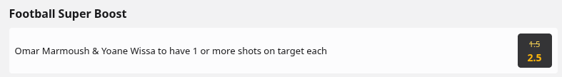 £10 Marmoush & Wissa 1 or more Shots on Target @ 2.50
