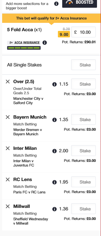 Bayern @ 1.35, Over 2.5 @ Man City @ 1.15, Inter @ 2.0, RC Lens @ 1.95, Millwall @ 1.36