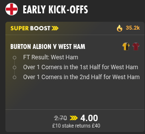 £10 West Ham win and get 2+ corners in each half @ 4.0