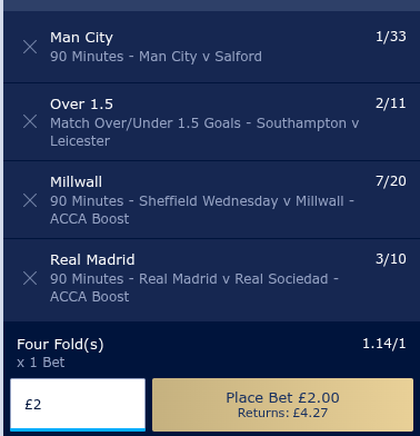 Man City, Over 1.5 @ Southampton, Millwall, Real Madrid £2 @ 1.14/1