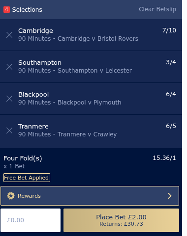 £2 FB Acca Cambridge, Southampton, Blackpool, Tranmere @ 15.36/1