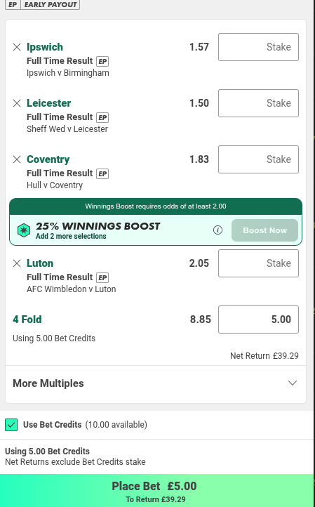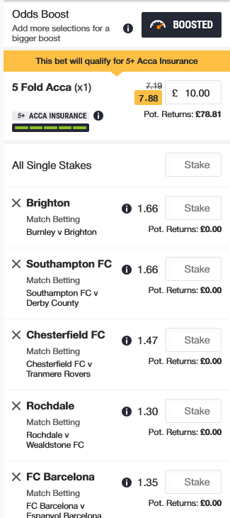 £10 Brighton, Southampton, Chesterfield, Rochdale, Barcelona @ 7.88 Boosted with Acca Insurance