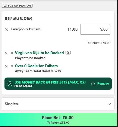 £5 BetBuilder van Dijk to be booked and Fulham to score @ 11.0