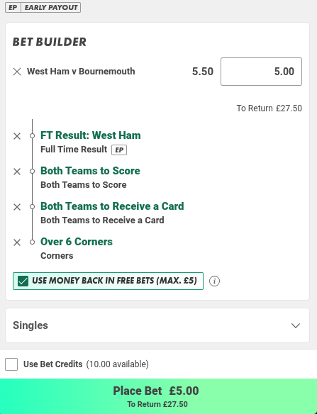 £10 West Ham win and get 2+ corners in each half @ 4.0