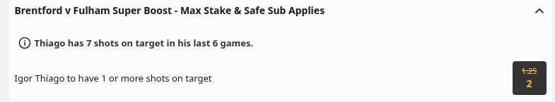 £10 Thiago 1 or more shots on Target @ 2.0
